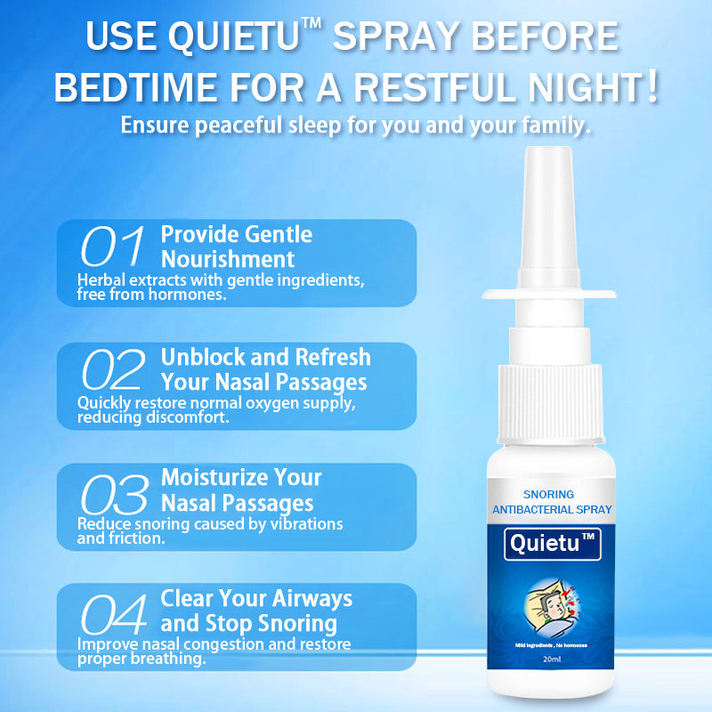 Quietu™ snoring nasal spray offers a solution to help stop snoring by addressing the underlying causes. By utilizing its unique formula, the spray works to reduce nasal congestion and clear the airway passages. The active ingredients in Quietu™ help to shrink swollen nasal tissues, providing relief from congestion and promoting easier breathing through the nose. By restoring proper airflow, the spray effectively minimizes the likelihood of mouth breathing and the resulting snoring, allowing individuals to experience a quieter and more restful sleep.